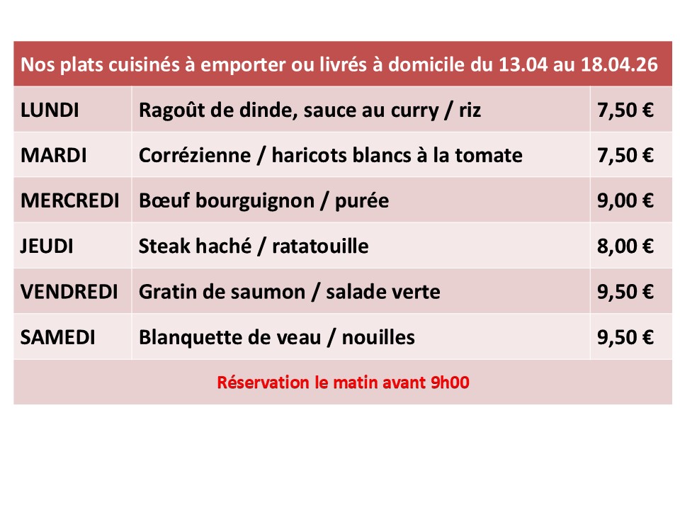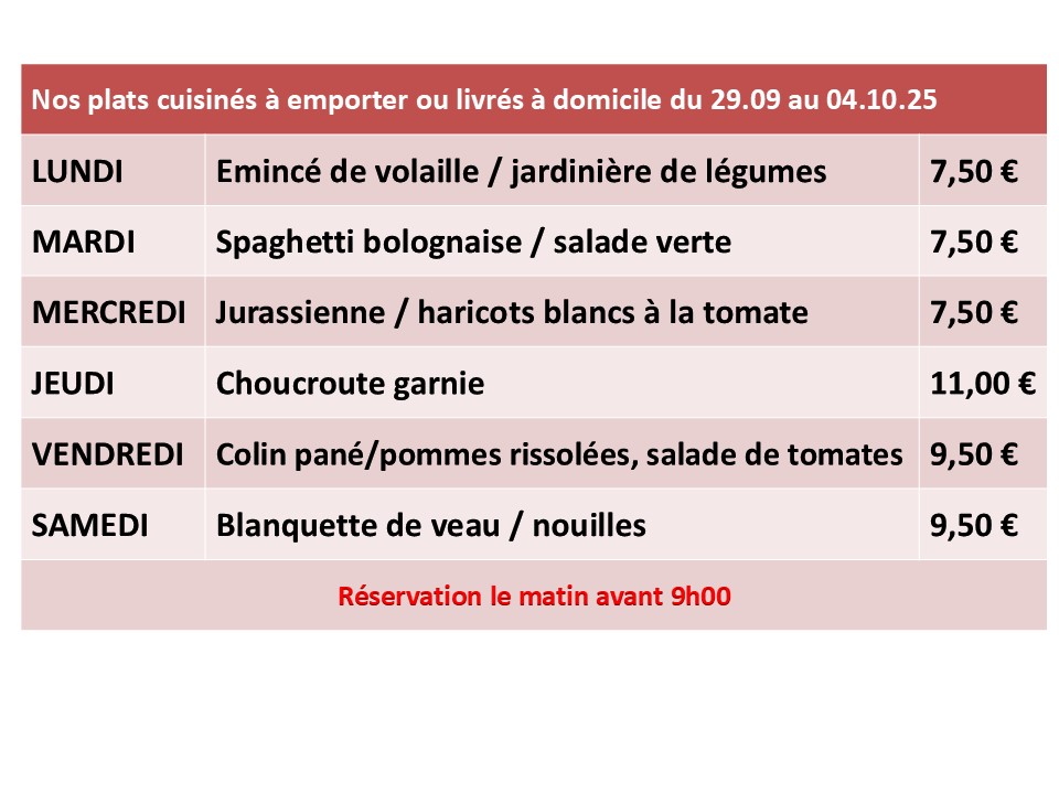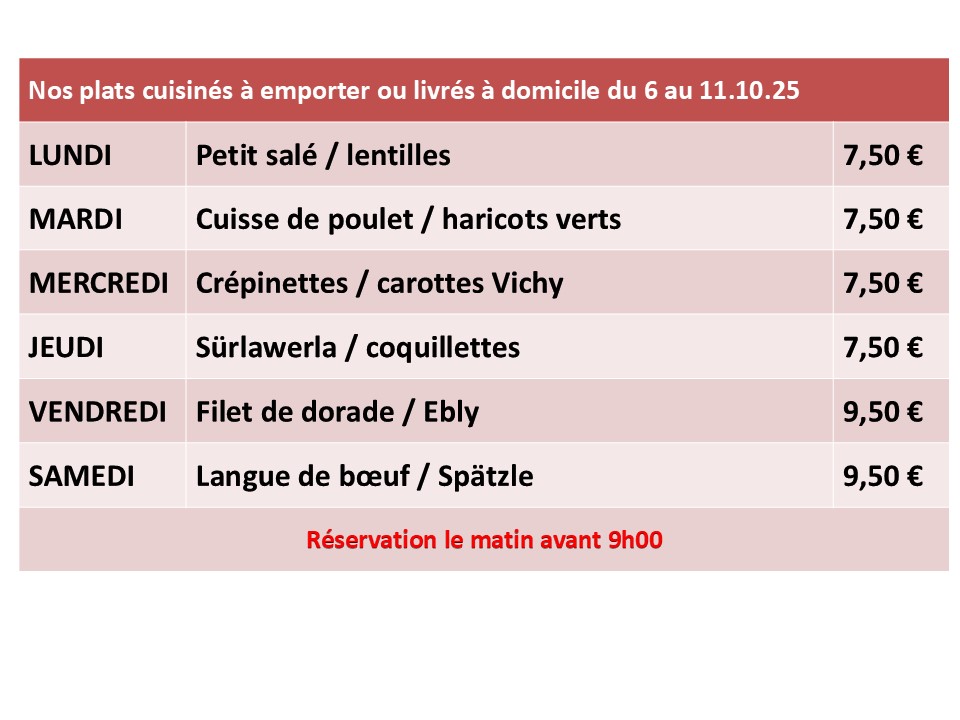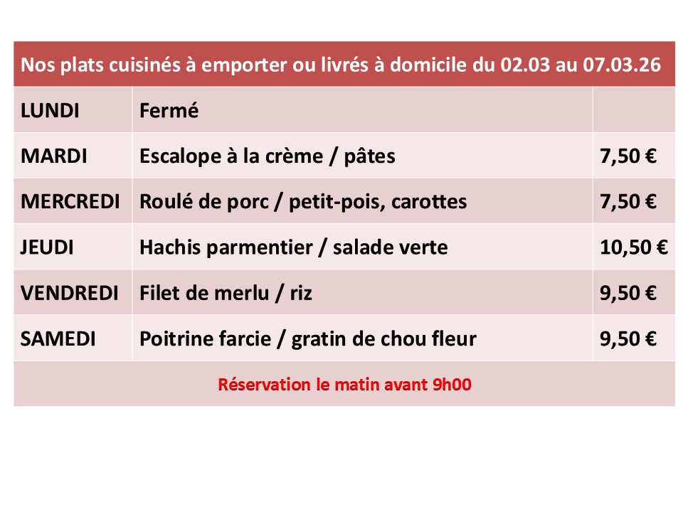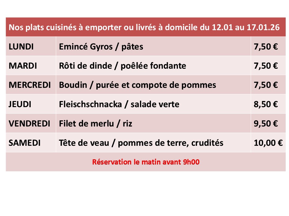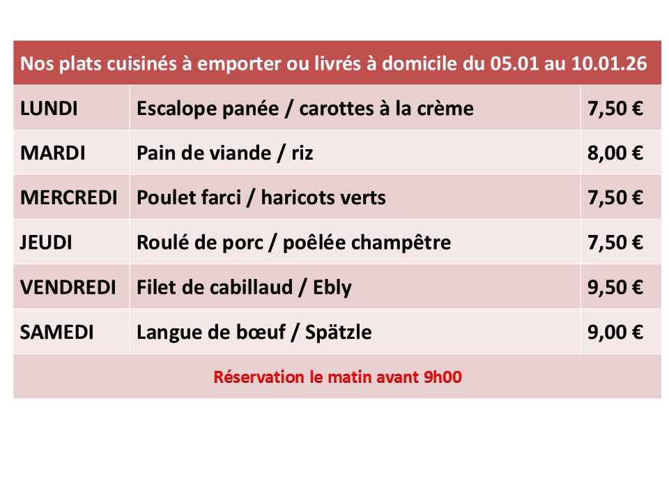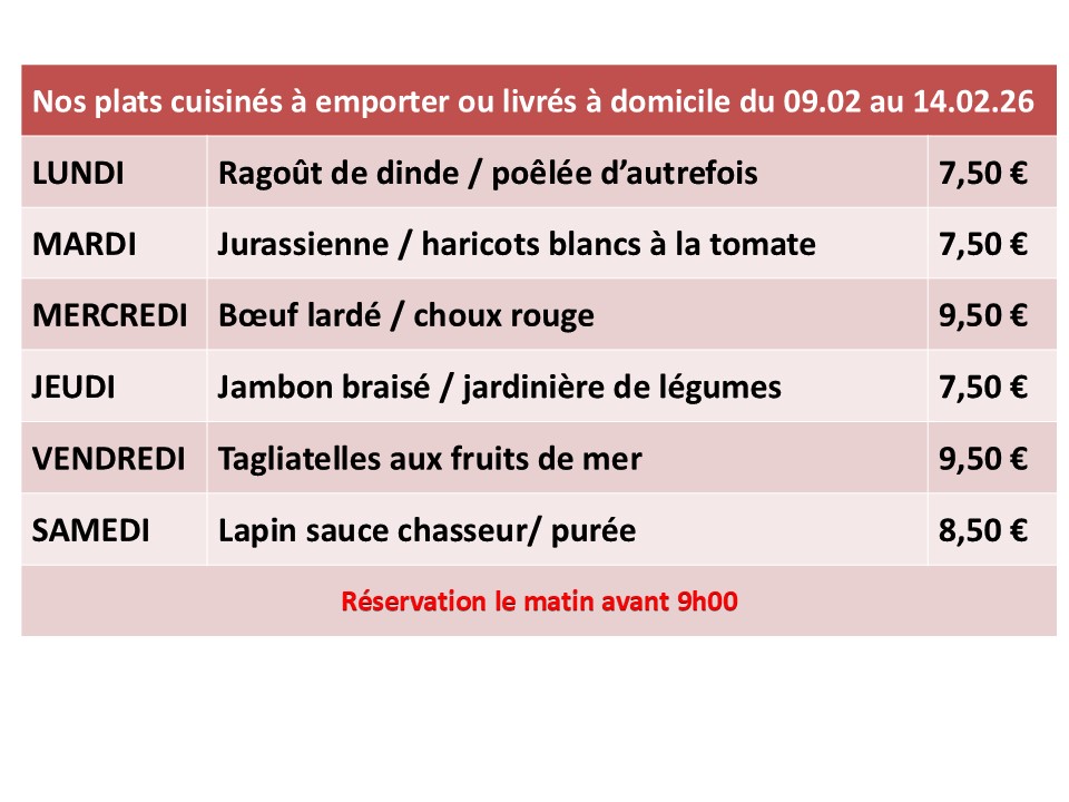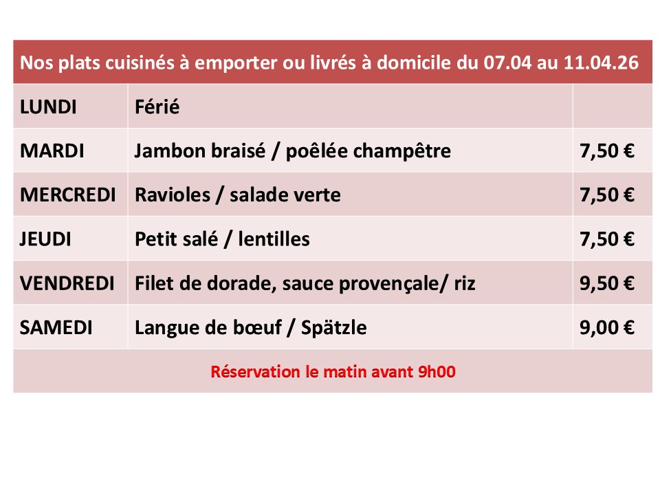 Chaque semaine, nous cuisinons des plats chauds complets et variés à emporter. Notre service de livraison peut également vous proposer le portage du repas à domicile (Moosch, Malmerspach et Saint-Amarin).